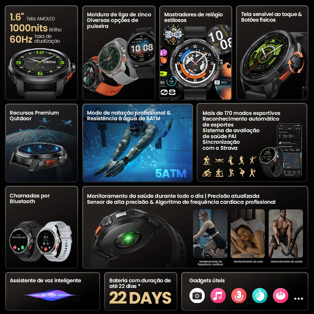 Relógio Inteligente Haylou Solar Ultra GPS com Tela AMOLED de 1,6”, Taxa de Atualização de 60Hz, Chamadas Bluetooth, Resistência à Água de 5ATM, Relógio Inteligente Esportivo